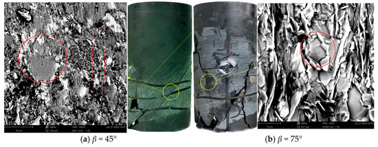 These phenomena reveal the formation of ‘pop-ins’ from a microscopic perspective. As the loading ratio continuously increases, the microcrack surface along the foliation plane gradually becomes smooth. The pop-ins phenomenon for β = 45° is caused by the gradual slippage of the contact surface within a certain period of time. However, the pop-ins phenomenon at β = 75° is caused by the sudden exfoliation of minerals, resulting in instantaneous slippage.