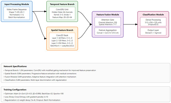 In addition to the ConvGRU architecture, our model incorporates a novel feature extraction and attention mechanism to enhance the learning of spatiotemporal dependencies, as shown in Algorithm 1. The feature extraction process consists of two main components: temporal feature extraction and spatial feature extraction. The temporal feature extraction module applies a series of operations to capture the temporal dynamics within the input video frames B. The process can be summarized as Algorithm 2. The spatial feature extraction module focuses on learning the spatial structure within each frame. It applies a similar set of operations as the temporal feature extraction module, with the addition of spatial convolution layers.