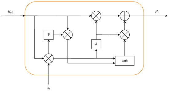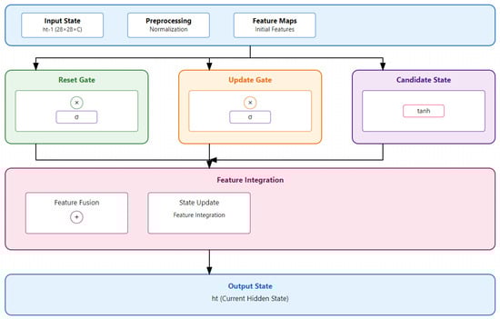 ConvGRU leverages the GRU’s capability to handle long-term dependencies in sequences while incorporating early fusion architectures to learn the evolution of appearance and motion features. Unlike traditional methods, ConvGRU further extracts spatial information from the abstract features during video prediction. Although the structure of ConvGRU appears similar to the basic ConvGRU architecture (as shown in Figure 2), its internal structure differs: the “cell” units use convolutional operations rather than fully connected operations to process input signals. The proposed ConvGRU-based architecture incorporates several key mathematical components. The core ConvGRU operations are defined as follows: