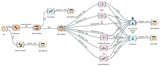 This study employed machine learning algorithms to predict power output (Po) based on time, environmental, technical, and locational variables. Machine learning offers a robust framework for handling complex datasets, capturing nonlinear relationships, and improving prediction accuracy through adaptive models [32]. The selected algorithms—random forest (RF), k-nearest neighbors (kNNs), gradient boosting (GB), linear regression (LR), and decision trees (Tree)—represent a diverse spectrum of approaches, ranging from simple interpretable models to sophisticated ensemble methods. These algorithms were chosen to comprehensively compare performance and interpretability while addressing the challenges of high-dimensional data and varying levels of feature importance [33]. By leveraging the strengths of these methods, this study aims to identify the most effective predictive model and gain insights into the underlying relationships between the dependent and independent variables [34]. The workflow diagram of the algorithms used for this study is given in Figure 1. In this study, Orange was used in the modeling, training, and validation stages of machine learning algorithms, which offers a visual interface to facilitate data mining and machine learning processes and is user-friendly.