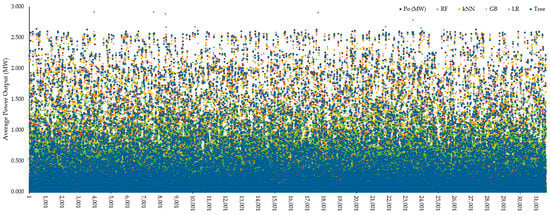 On the other hand, although the F-value of the t variable (9.19) is lower than other variables, it is statistically significant. It is accepted to be effective on the dependent variable. In addition, the effects of the variables Wt and Wd are more moderate but significant, with F-values of 25.96 and 25.37, respectively. These results highlight the role of each independent variable in modeling the dependent variable, with particular emphasis on wind speed, rotor speed, and wind farm variables. This study used machine learning algorithms (RF, kNN, GB, LR, and Tree) to obtain prediction data. Training and testing stages for the prediction data obtained from machine learning algorithms were considered 80% and 20%, respectively. The forecast data based on the algorithms and the data of the actual observations selected for forming the forecast data are compared in Figure 2.