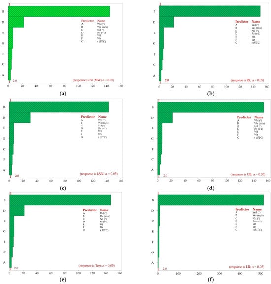 Pareto charts were obtained for the effect strengths of independent variables on the dependent variable by an ANOVA test performed for the prediction data of the dependent variable from machine learning algorithms. Pareto charts of machine learning algorithms and Po are presented in Figure 3. These charts are presented as Pareto charts created based on the ANOVA test results to evaluate the effect of independent variables on the dependent variable. The first chart (Figure 3a) shows the impact of the independent variables on the actual data selected in the testing phase. In this chart, Ws stands out as the highest effective variable, followed by Rs and Wd. Although other variables have a significant effect, their effects are relatively lower. This provides a compatible basis with machine learning models in measuring the impact of independent variables on the dependent variable.