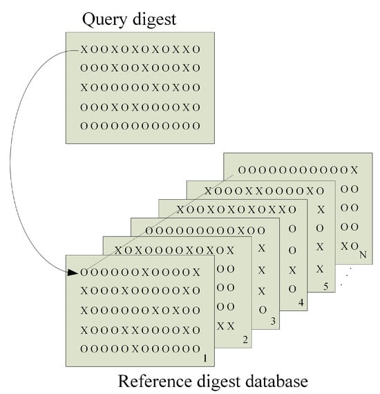To determine the search order for a given query digest , we first calculate values for the correlation between and each reference digest where . These calculated values are stored in an array , where each element represents the degree of correlation between and the corresponding . By sorting the elements of in descending order, we derive the sorted priority array , which serves as our search priority queue (SPQ). The initial element of possesses the highest value, signifying that its original index in aligns with the reference digest that is most likely to correlate with . Likewise, the second element of corresponds to the second most probable matching reference digest, and this sequence persists for the ensuing elements. Thus, the SPQ effectively determines the search order for the specific query digest .