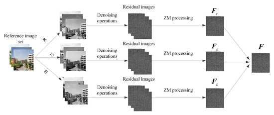 Empirical evidence suggests that when , a more accurate approximation of the true camera fingerprint can be achieved [1]. It is important to note that some studies, such as those by Chen et al. (2008) and Goljan et al. (2010), have utilized an alternative form of camera fingerprint, specifically the estimated PRNU factor [20,22]. Fundamentally, and exhibit minimal differences. To enhance the accuracy of our analysis, we preprocess both and , using the zero-mean (ZM) operation. This operation was originally introduced to eliminate non-unique artifacts (NUAs) that are present in different cameras of the same make or model [20]. For the purposes of this study, it is assumed that all fingerprints have undergone preprocessing with the ZM operation. Specifically, for the residual image , which comprises m rows and n columns of pixels. To simplify notation, we continue to use and as stand-ins for and , respectively. The extraction of a sensor’s pattern noise, commonly referred to as the camera fingerprint, involves several steps. Specifically, to ascertain the reference pattern noise for a particular camera, we denote this reference pattern noise as . Additionally, the size of the reference image set is represented by .