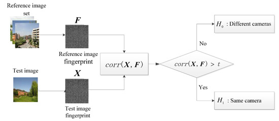 In this equation, represents the query signal, while denotes the reference signal. In this analysis, the symbol is used to denote the norm, and the overbar “−” signifies the mean of the respective signals. To simplify the examination, it is assumed that the two signals are perfectly synchronized. This assumption implies that there is no geometrical distortion present in the images or fingerprints being compared. The decision-making process involves comparing to a predetermined threshold t. If exceeds this threshold, the detector concludes , indicating that the query and reference fingerprints originate from the same camera. Conversely, if is below the threshold, the detector concludes , suggesting that the fingerprints are from different cameras. The threshold t is typically established based on the Neyman–Pearson criterion, as discussed in [22]. An illustration of this correlation detection framework is provided in Figure 6.
