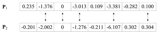 Goljan et al. [22] introduced the approximate rank matching search algorithm (ARMS), a fast search algorithm that outperforms the BFSA. Their approach involved two key improvements: the introduction of fingerprint digests and the selection of candidate-matching digests based on the most influential indices. Utilizing digests instead of full-length fingerprints significantly reduces computational complexity. A fingerprint digest is a sorted array of the k most significant components, based on their absolute values, where k is less than n. From a signal processing perspective, these defective pixels can be considered forensic feature pixels of the fingerprint. The second effort of the study draws inspiration from the Spearman rank correlation [36]. For two fingerprints, denoted as and , their corresponding digests are represented by and , respectively. Hereafter, any symbol with a “∼” indicates a digest. The positions of the elements in and are recorded as and . ARMS identifies the elements that most significantly influence the Spearman rank correlation coefficient between and as the key indices. To prevent confusion with fingerprint indices, we refer to these as the most influential elements instead. The rapid matching of the query digest with the reference digest is facilitated by the rank information derived from these influential elements. Figure 1 illustrates the fundamental concept of this selection criterion.
