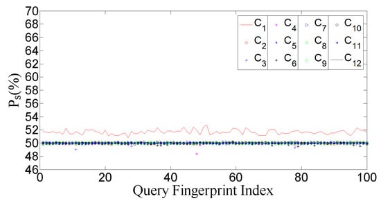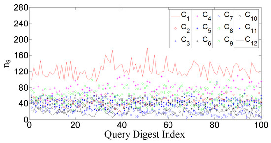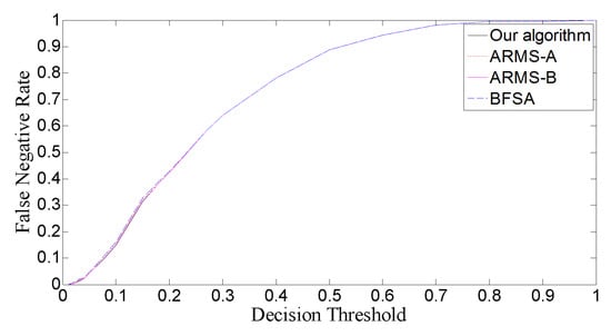Figure 18 and Figure 19 jointly prove that our algorithm retains the least erroneous detections under the same decision threshold. For a specific , FNRs for the three algorithms are almost the same, but FPRs for our algorithm are less than or at most equal to FPRs for ARMS and BFSA. The superiority of our algorithm is more impressive when falls in . As for the average search round, our algorithm outperforms ARMS (either ARMS-A or ARMS-B) though the margin over them (in particular, ARMS-B) is not large and approaches 0 with the increase in . Figure 20 exhibits that our algorithm always has the lowest , meaning that it has the highest accuracy in finding the matching reference digests. This result also verifies that artifacts from poor-quality query digests interfere with the accuracy of ARMS, and the local information employed by ARMS is not as robust as the global information utilized by our search scheme. BFSA still needs the largest search rounds. Note that for all three algorithms is directly proportional to . When approaches 0, for all three algorithms approaches 60, where TPRs .