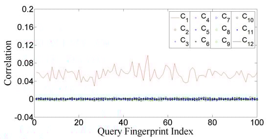 As stated before, algorithm performance is influenced by the quality of query fingerprints. In this work, we evaluate algorithm performance in a simulated environment, where good quality fingerprints are used, as well as in a real-world application scenario. In the former, we acquire good-quality query fingerprints using the computer. According to Equation (1), a noise residual can be modeled as a noisy version of the camera fingerprint. Thus, we rely on a reference fingerprint to generate its noisy version. Specifically, given a reference fingerprint , we use the MATLAB function AWGN to add WGN (white Gaussian noise) into , where , and is independent of . We let the control parameter SNR (signal-to-noise ratio) of AWGN equal 40 dB to yield good-quality resulting signals. For 70 cameras, we generate 70,000 fingerprints, i.e., each reference fingerprint responsible for 1000 simulated fingerprints.