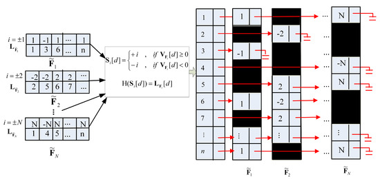 where refers to the sign function. By using Equation (4), we can map the i-th digest into a sequence of “+i” and “−i”.