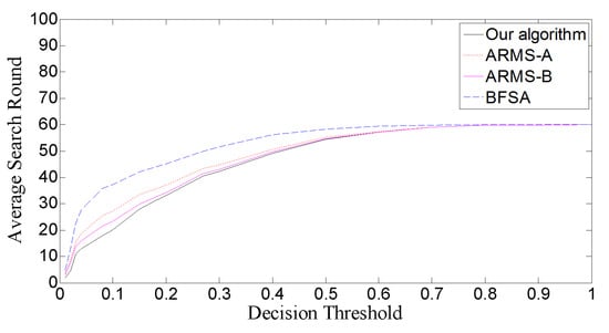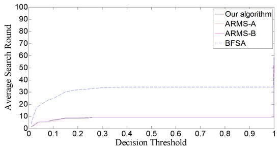 Average search round versus decision threshold curves for three algorithms in a simulated environment.