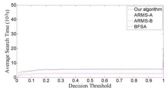 Average search time versus decision threshold curves for three algorithms in a real-wold environment.