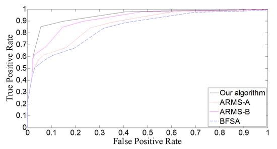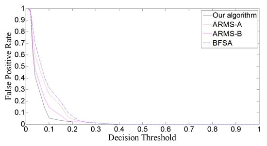In the realm of ROC space, enhanced decision-making or detection capabilities are denoted by a curve that is situated higher and further to the left. As illustrated in Figure 17, it is apparent that the ROC curves for all three algorithms have moved downward and to the right, signifying a reduction in performance relative to the simulated environment addressed in the preceding subsection. Notably, the ROC curve for our algorithm exhibits less change compared to those of ARMS and BFSA. Specifically, for any given false positive rate (FPR), our algorithm achieves the highest true positive rate (TPR), and conversely, for any given TPR, it maintains the lowest FPR. This demonstrates that our algorithm outperforms the other two algorithms. Among the three, BFSA exhibits the poorest performance.