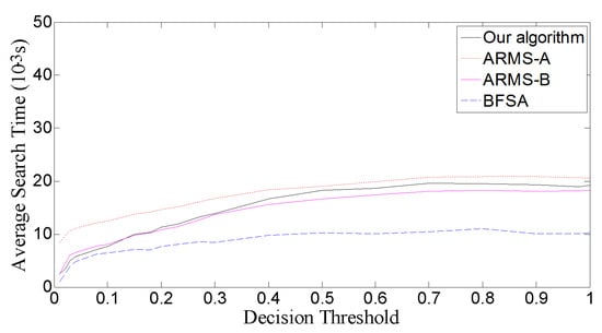 Average search time versus decision threshold curves for three algorithms in a simulated environment.