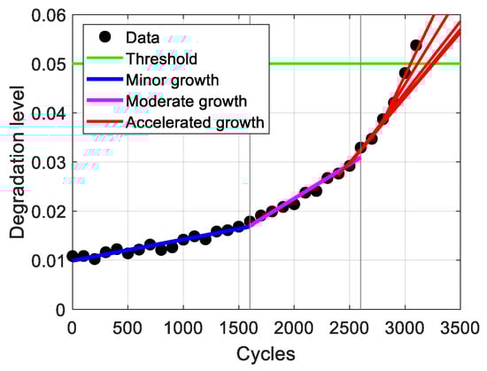 From the results in Figure 2, the moderate growth stage () begins at , and the first regression is performed at 1900 cycles () after three additional data points are collected (see in Equation (4)). The first regression result for the moderate growth stage is shown in Figure 4a. In the figure, the gray dots represent data used to divide the minor growth stage, while only the black dots are used to establish the criteria for the newly started moderate growth stage. The regression result using the four data points is shown as the magenta line in the figure. Similarly, Figure 4b shows the final regression result for this stage (), using 11 data points collected every 100 cycles from 1600 to 2600 cycles, while Figure 4c presents eight regression results obtained every 100 cycles from 1900 to 2600 cycles. Figure 4d depicts the slope of the regression models during the moderate growth stage, which increases consecutively four times from 2200 to 2600 cycles. With the moderate growth stage ending at 2600 cycles, Step 2 proceeds to predict the RUL of this example.