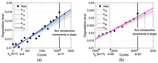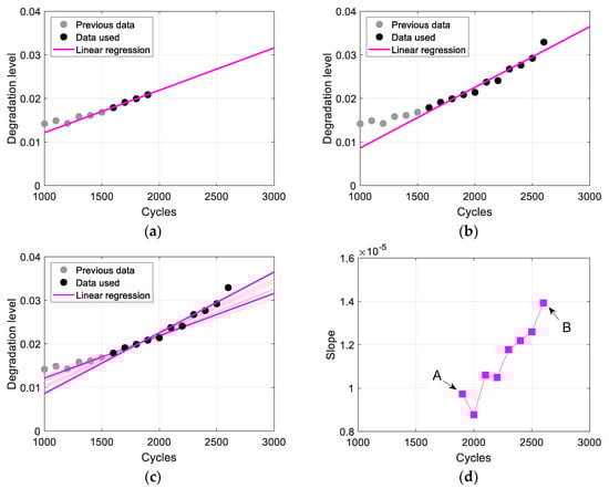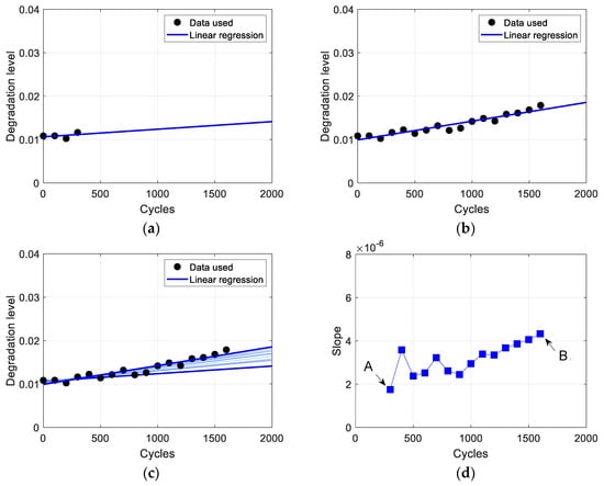The proposed method is explained using a specific example for better understanding, and Step 1 in Equation (4) is applied to divide the stages. First, the minor growth stage () starts with . Figure 3 shows the regression results for this stage, where the black dots represent degradation data obtained every 100 cycles, and the blue lines depict the linear regression results using these data. Figure 3a shows the first regression result using four data points collected up to 300 cycles (), while Figure 3b shows the final regression result in this stage, using 17 data points collected up to 1600 cycles (). Fourteen regression results, obtained every 100 cycles from 300 to 1600 cycles, are displayed in Figure 3c. In the proposed method, the criterion for dividing the stages is based on the slope of the regression model, as illustrated in Figure 3d (in the figure, A and B indicate the slopes in Figure 3a and Figure 3b, respectively). As shown, the slope increases consecutively four times from 1200 to 1600 cycles, indicating that 1600 cycles () mark the end of the minor growth stage.