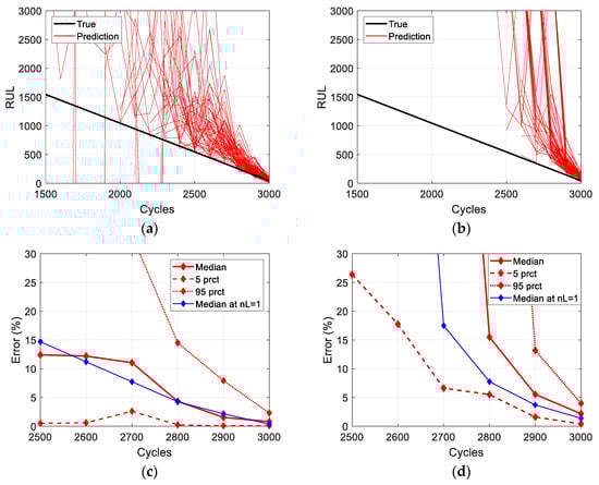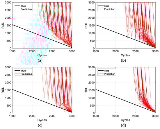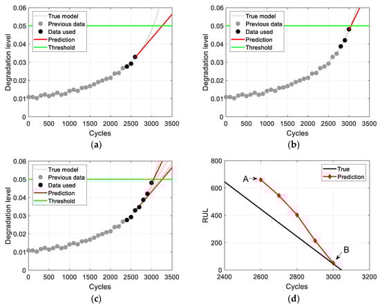 Step 1 ended at 2600 cycles (), and Step 2 in Equation (5) starts with , assuming . The first prediction in the accelerated growth stage starts at 2600 cycles, and the result is shown in Figure 5a. In the figure, the prediction result, denoted by the red line, is obtained using the most recent three data points, represented by the black dots. The predicted EOL, which is when the red line reaches the green horizontal line (), is 3260 cycles. Therefore, the RUL becomes 660 cycles (), as indicated by the red diamond marker at 2600 cycles in Figure 5d. For reference, the gray curves in Figure 5a–c represent the true degradation behavior, and the black diagonal line in Figure 5d represents the true RUL. The last prediction in this stage is performed at 3000 cycles (), also using the most recent three data points, as shown in Figure 5b. The RUL prediction is indicated by the red diamond marker at 3000 cycles in Figure 5d. The red lines in Figure 5c show five prediction results performed every 100 cycles from 2600 to 3000 cycles. The final result obtained from the proposed method is the RUL prediction for the entire accelerated growth stage, as shown in Figure 5d.