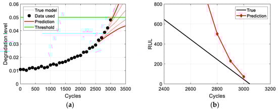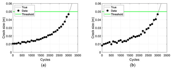 The black curve in Figure 6 represents the true degradation growth without measurement error, obtained using Equation (7) and the given parameter values, calculated at every 100 cycles. The final data are generated by adding uniformly distributed random noise to the true growth at two different levels to mimic measurement error in practice. The 31 black dots (generated every 100 cycles from 0 to 3000 cycles) in Figure 6a,b represent examples of the final data, with noise levels of and , respectively. Although the noise level remains constant, the generated data may differ with each run due to the inherent randomness of the uniformly distributed noise, leading to variations in the prediction results. Therefore, a total of 100 data sets (with Figure 6 representing one of them) are generated for each noise level to compare the two methods. Lastly, the degradation threshold is assumed to be 0.05 m, represented by the green horizontal line in the figure.