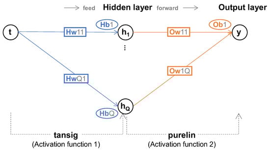 ANNs can theoretically model any relationship between input and output by adjusting the number of hidden layers and nodes in these layers and using different combinations of activation functions. This is achieved by minimizing the difference between the model’s output and the actual data using optimization algorithms, such as the Levenberg–Marquardt algorithm, to estimate the weights and biases. A feed-forward neural network [] with one hidden layer is commonly used to approximate degradation behavior, and the architecture used in this study is shown in Figure 7. The number of input and output nodes in each layer is one, representing time () as the input and degradation data () as the output. While the activation functions between layers are a common combination of the tangent sigmoid and pure linear functions, the number of hidden nodes in the hidden layer must be adjusted according to the specific application. Therefore, the optimal number of hidden nodes is determined by testing. The remaining conditions, including the hyperparameters required to implement the ANN, use the default settings in MATLAB, with more detailed information available in reference [].