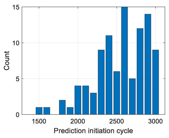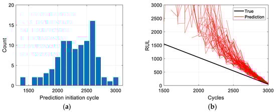 First, 100 data sets with a noise level of are used, and the prediction results obtained by applying the proposed method to these data are shown in Figure 8. Figure 8a presents the distribution of the first prediction cycle, denoted as in Step 2 of Equation (5), from 100 data sets, which is caused by the random noise in the data. In the figure, the most frequent first prediction cycle is 2600 cycles, and the majority of the data (82 out of 100) fall within the range of 2000 to 2700 cycles. The red lines in Figure 8b show the RUL predictions from the 100 data sets, while the black diagonal line represents the true RUL. It can be seen that as the cycle increases, the prediction results become closer to the true RUL. The result shown in Figure 5, which was used to explain the proposed method in the previous section, is 1 of these 100 predictions, where the prediction begins at 2600 cycles.