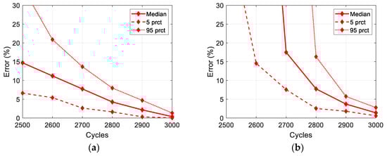 where and indicate true and predicted values, respectively. Since the magnitude of errors using RUL becomes sensitive as the remaining cycles decrease, the EOL is used for error calculation instead. The true EOL is 3045 cycles, and the prediction errors from the two methods are shown in Figure 11. In the figure, the solid red line represents the median error across available prediction results at each cycle, while the dashed and dotted lines represent the 5th and 95th percentiles of the error, respectively. It is clearly shown that the error from the proposed method in Figure 11a is much smaller and more precise than that from the ANN in Figure 11b.