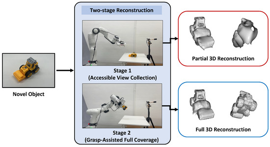 We propose the See-Then-Grasp (STG) method for active 3D modeling using a single robotic manipulator system. This method allows the robot to interact with the object, efficiently exploring and addressing uncertain regions for comprehensive 3D reconstruction. The pipeline consists of two main stages. The first stage is an accessible view collection. In this stage, the robot’s hand-eye camera captures initial images from reachable viewpoints, building a preliminary understanding of the object’s geometry. The second stage involves grasp-assisted full coverage. In the second stage, the robot grasps the object and uses a fixed external camera to capture additional images from previously inaccessible angles, ensuring complete 3D coverage. The entire pipeline is summarized in Figure 2.