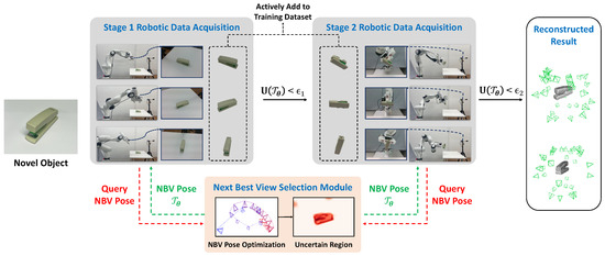 After performing the optimization iterations, corresponds to the camera pose with the highest uncertainty. In other words, by moving the manipulator to satisfy this camera pose with respect to the novel object and actively updating the dataset, the 3D model can be reconstructed more quickly. A robotic pipeline capable of performing full 3D reconstruction of the object will be introduced in Section 4.3.