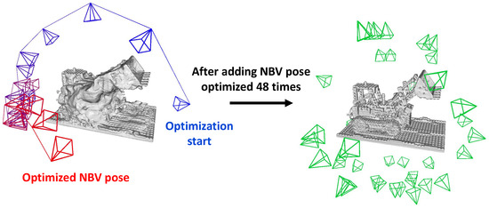 where and are scaling parameters. By optimizing with a gradient descent optimizer such as Adam [47], gradually moves toward viewpoints with increasing uncertainty within the current scene. As shown in Figure 4, our proposed NBV pose optimization enables direct optimization for uncertain viewpoints, allowing for 60% faster exploration compared to the fixed view candidate methodology.