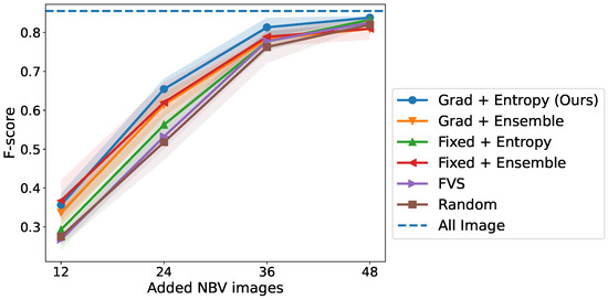 F-score improvement plot for the baselines on the Ficus dataset. We analyze the F-score improvement on the Ficus dataset using 12, 24, 36, and 48 NBV images, with the results averaged over five random seeds. The mean-variance plots show that our baseline quickly identifies regions that significantly boost the F-score, especially in the early stages of NBV selection.