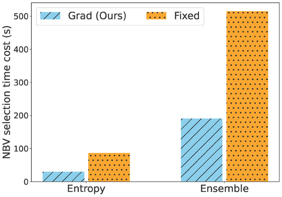 Comparison of NBV selection time costs. We measured the time for each NBV selection across different uncertainty techniques and methods. The sky blue textured bar represents the time taken when performing our NBV pose optimization, while the orange textured bar represents the time taken when selecting the NBV pose using fixed view candidates. Our method consistently incurs lower time costs compared to the fixed candidate method.