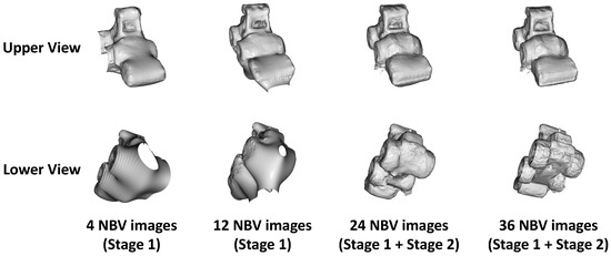 To validate the effectiveness of our two-stage method, we provide the qualitative results of iterative 3D reconstructions at each stage in Figure 10. As shown in Figure 10, during stage 1, where 4 and 12 NBV images are added, the approximate geometry of the Toy car can be captured from the upper view. However, the geometry from the lower view, which is inaccessible to the view space, cannot be adequately captured. Subsequently, when 24 NBV images are added, the data from stage 2 begin to improve the geometry of the bottom view. When 36 NBV images are added, the geometric details from all views can be fully captured. Thus, our STG method effectively achieves a comprehensive 3D reconstruction of the object.