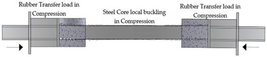 Figure 2 shows the RBRB behavior under compression. The force is transferred from the end joints to the core, which responds to this force by undergoing local buckling as it is restrained and bonded within the concrete, dissipating some of the energy. Concurrently, the applied force causes the dividers attached to the core to move, compressing the inner rubber components situated between the dividers and the concrete. This results in the compression of the inner rubbers. The inner hyper-elastic rubber acts under compression, generating a resistant force and providing additional resistance to the local buckling of the steel core.