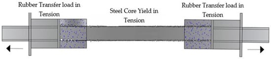 Figure 3 indicates RBRB performance under tension. During tension, the incoming force is transferred from the end joints to the core, leading to energy absorption through the elongation of the core. This elongation decreases the cross-sectional area of the steel core. Simultaneously, the load is transmitted to the dividers, which push the two outer rubber components, compacting them between the dividers and the concrete. The outer hyper-elastic rubber components, now under compression, generate additional force resistance, supplementing the tensile resistance of the core.
