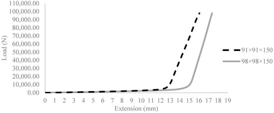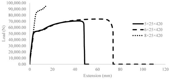 Based on the test results, as shown in Figure 6, all samples exhibited a similar pattern up to the yield strength of the steel. However, due to their different cross-sectional areas, they displayed varying strain hardening behaviors to reach ultimate strength. The 5 mm and 6 mm samples achieved maximum displacements of 43 mm and 73 mm, respectively. For the 8 mm steel sample, the maximum load reached 95 kN at a displacement of 14 mm. The test was then stopped due to the tensile testing machine’s (UTM) limitation of a maximum tensile strength of 100 kN.
