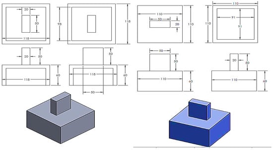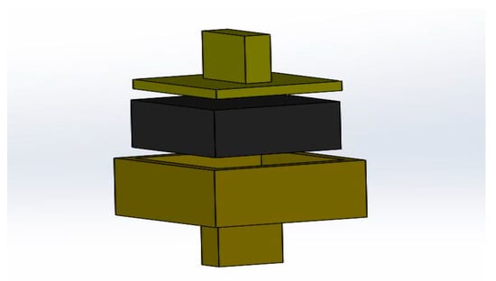 The dimensions of the rubber blocks are 91 × 91 × 150 mm and 98 × 98 × 150 mm for Rubber1 and Rubber2, respectively. Figure 7 illustrates the configuration of these rubber blocks. The differing dimensions of these rubber blocks and their molds are due to the variations in the cross-sectional area of the elastic and plastic core sections. The stiffness of the high damping rubber used was set to 70 kN/mm, which is typical for normal rubber material stiffness. In the RBRB system, two steel molds were manufactured to house the rubber blocks, as shown in Figure 8.