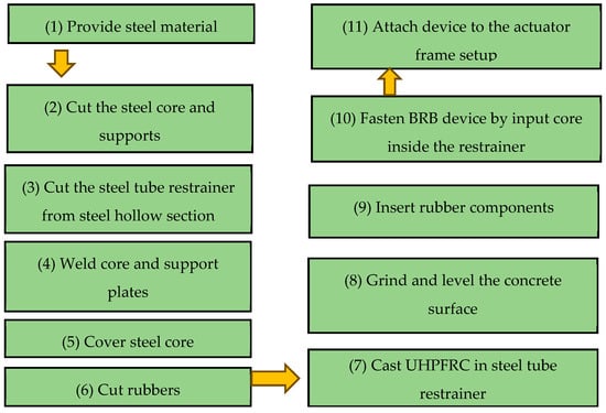 In the fabrication process of conventional BRBs, the core components are divided into two sections: 40% for the plastic section and 60% for the elastic section [80]. Next, the core is placed inside a hollow steel tube restrainer, which serves to confine the device. After this step, concrete is cast inside the hollow steel section, surrounding the core while maintaining a gap to allow for local buckling of the core element.