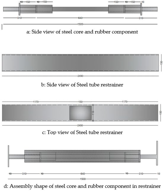 Given the identified limitations of conventional BRBs, it was determined that a high-performance, lightweight BRB system is needed. Such a system should not rely heavily on core element manipulation or extensive calculations to enhance performance and mitigate existing issues. The incorporation of rubber in the BRB design is due to its high bulk modulus of elasticity (K) and low shear modulus (G). Rubber’s high resistance to volume change under load ensures sufficient load-bearing capacity due to its high stiffness characteristics. As an incompressible material, rubber has a Poisson’s ratio of exactly 0.5. For applications where rubber is not highly confined, assuming incompressibility is reasonable and is a critical component of many mathematical models developed for rubber [77,78,79]. Rubber in RBRB enhances the vibration dissipation capacity and absorbed energy of the system.