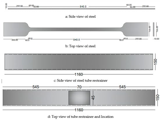 Three different thicknesses of steel sections of 5 mm, 6 mm, and 8 mm (Figure 4) were chosen based on the aforementioned calculation. To evaluate their tensile capacity, the cross-section area can be between 30 mm2 and 50 mm2. The steel components were certified based on A36 [83]; also, all the coupon tests result for the steel samples were provided by the same supplier.