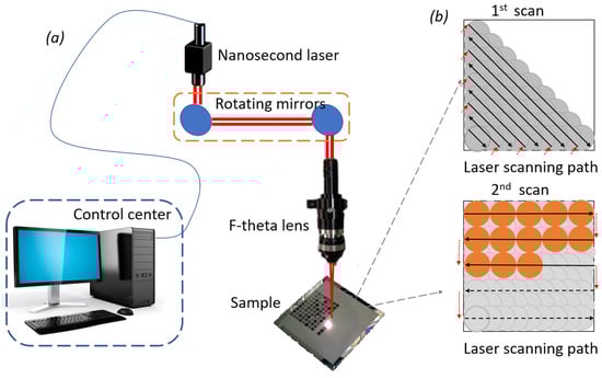 This experiment used 100 mm × 100 mm 304 stainless steel material with a thickness of 1 mm. Before laser processing, we used a 95% concentration of industrial alcohol to wipe the stainless steel surface clean, dissolving and removing surface stains, and dust-free wiping paper was then used to wipe the stainless steel surface again. The setup used in this experiment is shown in Figure 1a: a laser system was centrally controlled by a computer to laser-process the stainless steel surface, and the laser light emitted by the laser source was controlled by a galvanometer to determine the direction of motion and the processing position. The maximum output power of the IPG fiber laser used in this experiment was 20 W. The wavelength of the nanosecond laser was 1064 nm; the pulse repetition frequency was 1.6~2000 kHz; the pulse widths were 1.5, 2.5, 4, 8, 16, 30, 50, 120, 200, and 350 ns; and the effective scanning speed range was 0~7000 mm/s. The focal length of the F-theta lens was 160 mm. The minimum spot size of the IPG fiber laser used in this experiment was 40 μm, and the theoretically achievable maximum resolution was 635 dpi × 635 dpi. The resolution increases as the minimum spot size of the laser decreases.