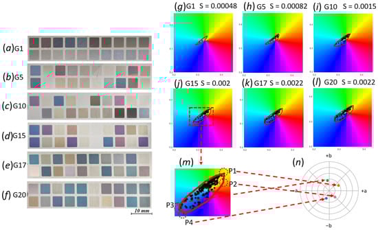 Figure 4a–f shows representative six-generation experimental results of this experiment. In this paper, we adopted the color gamut maximization prediction to explore the whole color gamut; converted the color parameters from CIELAB color space to CIE 1931 color coordinates; used the position information of the color parameters in color coordinates to predict the maximum color gamut of the current generation of populations, as shown in Figure 4g–l; and used Equation (7) for the calculation of selecting the current optimal color gamut’s representative color. We added the algorithm for selecting the optimal color gamut’s representative color by hue to the genetic algorithm, and there were four groups of optimal color gamut representative colors for each generation of marking, which represented the maximum range of the color gamut that could be achieved by the current marking samples, as shown in Figure 4m. These four color parameter combinations were retained in the next generation of the population and participated in the genetic process of mutation and crossover, which ensured that the optimal genes were continuously updated and inherited.
