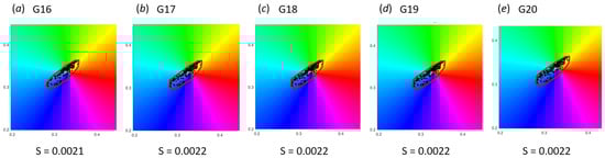 When the experiment was carried out to the 18th generation, it was found that the size of the color gamut was the same as that of the 17th generation, and continuing the experiment, it was found that the size of the color gamut did not change from the 17th generation to the 20th generation of the experiment although the color parameters were increasing, and we considered the genetic process to have reached convergence. In the results as shown in Figure 5a–e, the 16th generation had not reached convergence, and the color gamut increased by 0.0001 in the transition from the 16th generation to the 17th generation of the population. After the 17th generation reached convergence, the color gamut remained unchanged from the 18th to the 20th generation in the validation experiments, having stabilized at 0.0022, which indicated that the maximum color gamut of the stainless steel surface had been found. From Figure 5b–e, it can be seen that the number of parameter points in the blue and green color phases gradually increased, but because the color weight was always smaller than the color weight of the best color gamut representative color in the current generation, while the newly emerged colors were still in the range of the color gamut, the size of the color gamut did not change, and the genetic algorithm reached convergence.