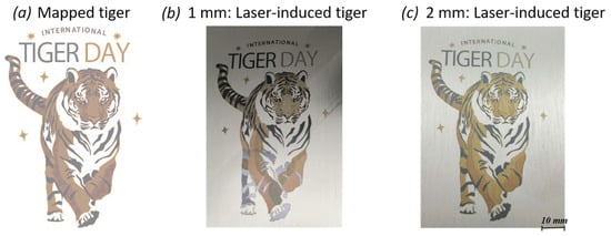 In this paper, a cartoon tiger color gamut to match the laser parameters corresponding to the most suitable color in the stainless steel color gamut. The output is the laser parameters corresponding to the color mapped by the color gamut. The image vectorization tool converts pixel information in the image into vector-format information through edge detection and curve fitting, which is necessary image and a cartoon temple image were prepared. First, the color of the target image was mapped onto the gamut of colors achievable on stainless steel by using the image color mapping toolkit. Then, the color-gamut-mapped image was divided through color separation into four basic color laser processing images that are within the color gamut of stainless steel, such that they can be presented through laser coloring. Finally, these four basic color images were converted to vector format for laser processing using the image vectorization toolkit; the results are shown in Figure 6a–d. Figure 6a,c are the images after color gamut mapping of the original images, and Figure 6b,d are the color reproduction images of the laser-induced coloring; the resolutions of the tiger image and temple image are 166 dpi × 154 dpi and 209 dpi × 211 dpi, respectively. As shown in the figure, the color hue and saturation of the tiger’s face, tail, and front leg parts in Figure 6b remained basically the same as those of the corresponding positions in Figure 6a, which indicates that our mapping algorithm was effective in mapping the color hue of the original image to the color gamut that the stainless steel surface is able to achieve. Similarly, in the temple image, most of the color tones reproduced in Figure 6d match the mapped image in Figure 6c, and the color tones were basically the same between the color-gamut-mapped image and the reproduced color image, which is the purpose of our color gamut mapping. However, the color tone of the tiger’s hind legs and other parts in Figure 6b was distorted, resulting in serious color cast issues, which we did not want to see.