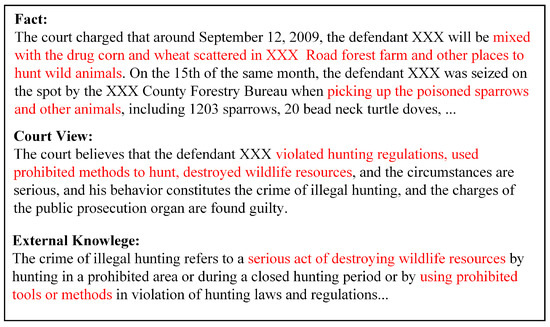 Figure 1. This figure demonstrates the application of EKICAN in predicting outcomes for criminal environmental cases. It highlights the structured inputs of the model: Fact Description, Court View, and External Knowledge related to environmental laws. The red highlighted sections show where the model focuses intensively within these inputs, essential for accurate judicial reasoning simulation.