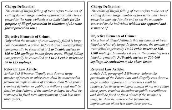 Environmental law was chosen as the focus of this study because it presents distinctive challenges that underscore the necessity of advanced predictive models. Unlike many other legal domains, where offenses may differ substantially in both definition and fact patterns, environmental law often contains sets of crimes and violations that share high degrees of semantic overlap and similar legal logic. For example, in environmental law, the offenses of illegal logging and theft of trees have only slight differences in their objective elements under Chinese criminal law judgments. This high level of similarity necessitates a specialized domain model capable of making precise distinctions, thereby justifying the focus on environmental law for our research.