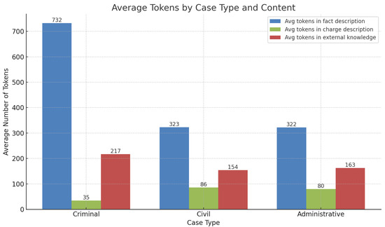 The disparity in token distribution between civil and administrative cases versus criminal cases, as illustrated in Figure 4, is primarily due to the methods employed in generating the descriptions. Civil and administrative case descriptions are generated using a large language model that has been fine-tuned with LoRA on environmental law-specific corpora, aiming to provide comprehensive narratives. The fact descriptions in criminal cases are extracted using rule-based techniques, which typically yield more extensive factual details but shorter, more succinct charge descriptions.