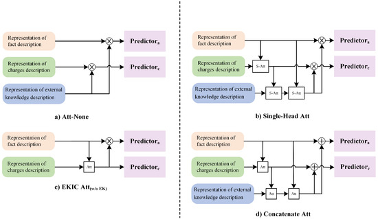 Figure 5. (a) Att-None: Direct integration of independent fact, charge, and knowledge representation via pointwise multiplication, without employing attention mechanisms. (b) Single-Head Att: Employs a single-head attention (S-Att) mechanism to enhance feature integration through pointwise multiplication. (c) EKICAN (w/o EK): Utilizes a basic attention module to merge fact and charge representations directly, without external knowledge. (d) Concatenate Att: Features multi-head attention, where outputs are concatenated to capture complex interdependencies among input features effectively.