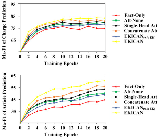 We presents the analysis of the results derived from our experiments, specifically focusing on the trends exhibited across different architectural setups over training epochs. This is depicted in Figure 6, which illustrates the evolution of Macro-F1 scores across training epochs for various models engaged in charge and article prediction tasks. We can conclude the following: The Concatenate Attention model demonstrates consistent improvement over time, underscoring its ability to effectively integrate multiple information streams. This model reaches peak performance quicker than others, highlighting its efficiency in learning complex relationships within legal texts. The models without external knowledge, denoted as EKCICAN (w/o EK), exhibit a slight decline compared to their counterparts that utilize external knowledge. This validates that external knowledge plays a crucial role in enhancing model accuracy by providing context.