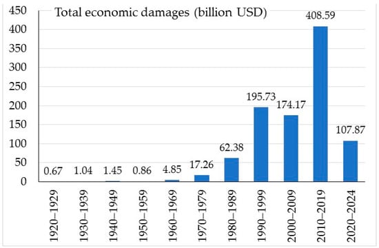 Economic losses due to earthquakes worldwide per decade over the last 100 years [source: https://ourworldindata.org (accessed on 21 November 2024)].