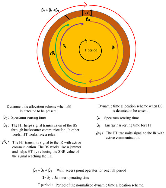 The proposed system model and the dynamic time allocation scheme based on spectrum sensing are shown in Figure 1 and Figure 2, respectively. The system model consists of a BS, IR, HT, WiFi access point, (n = 1, 2, …, N), and jammer. The BS is a signal emitter that broadcasts in the environment and transmits its information to the IR. HT uses the communication infrastructure of the BS and delivers its own information to the same receiver in a symbiotic relationship with it. overhears the information BS and HT sent to IR. The jammer is a friendly terminal that prevents information leaking to . The WiFi access point placed in the same cell, i.e., indoor as the HT is a terminal that partially supports the energy harvested by the HT with the signal it emits.