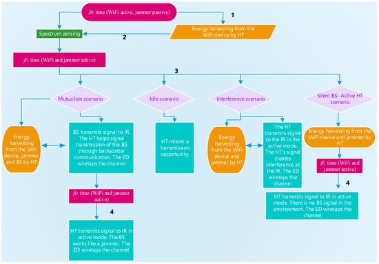 Four different operating modes for HT are shown in Figure 3. The spectrum sensing unit detects the activity of the BS with energy detection-based spectrum sensing. During this process, the energy required for HT is met from the initial energy . The energy harvesting unit allows the HT to harvest energy from the BS, jammer, and WiFi access point that emit signals to the environment. The battery is charged with the harvested energy.
