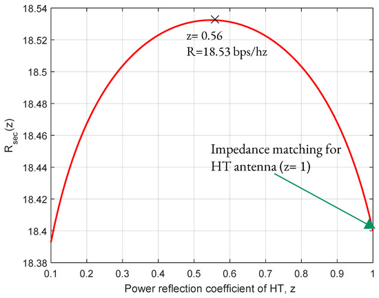 The variation in the function with respect to z for = 17 kW, = 0.39, = 0.41, = 0.2, N = 3, = 100 W is shown in Figure 5. There can be a single z value that maximizes the function, which has a concave structure with respect to z. In the case of z = 1, where the entire signal transmitted from the BS is backscattered by the HT, which helps the BS in transmitting information, the HT does not harvest energy from the BS’s signal. In this scenario, HT works with impedance matching, but the maximum secrecy rate cannot be achieved. For the given simulation values, the maximum value of = 18.53 bps/Hz is reached at z = 0.56.
